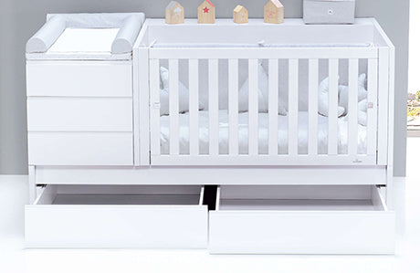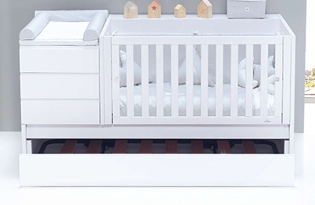 En un mismo mueble tendrás la cuna de 70x140cm, una mesita con 3 cajones y zona cambiador en la parte superior, un book estantería en el lateral con dos espacios de gran capacidad y, en la parte inferior 2 cajones o una cama nido (a elegir).