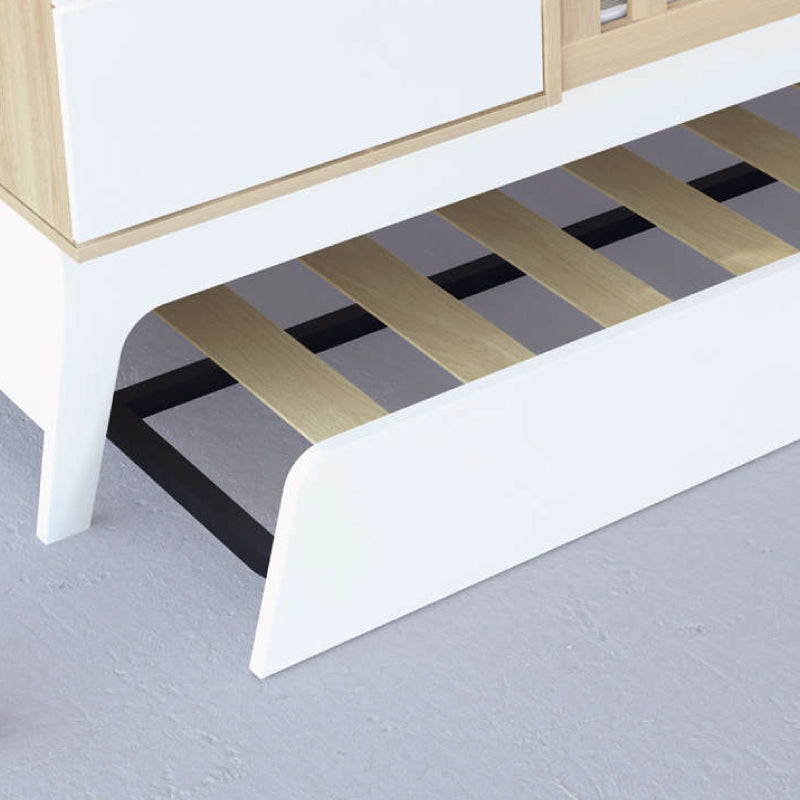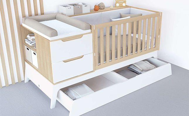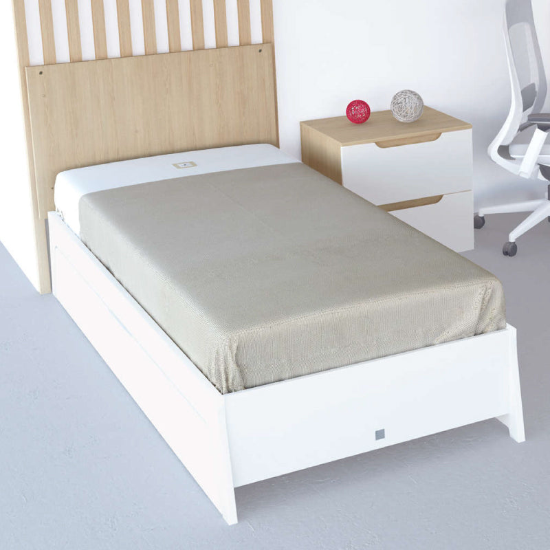 El combo perfecto de comodidad y estilo, así es nuestra cuna de 70x140 cm ZEN (con cajones inferiores o cama nido), convertible en habitación infantil-juvenil. ¿Aburrido de las cunas tradicionales? Sus patas curvas le dan un toque elegante y sofisticado que harán que tu bebé se sienta único en su habitación desde el principio. Pero espera, ¡hay más! Se convierte en una habitación completa con cama de 90x200 cm para cuando crezca, una mesita de 2 cajones para guardar su ropa interior, un escritorio para hacer los deberes y una book estantería para colocar sus libros. Todo en blanco y madera, un estilo atemporal que no tiene edad. Además, dispone de 5 alturas diferentes de somier y barandilla sube-baja, para facilitar el acceso de la mamá o del papá a la cuna.